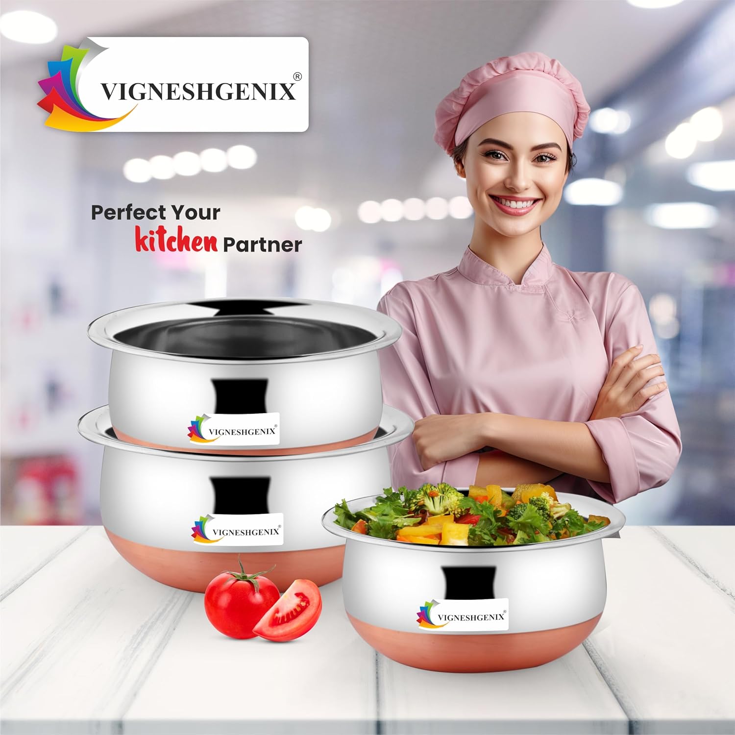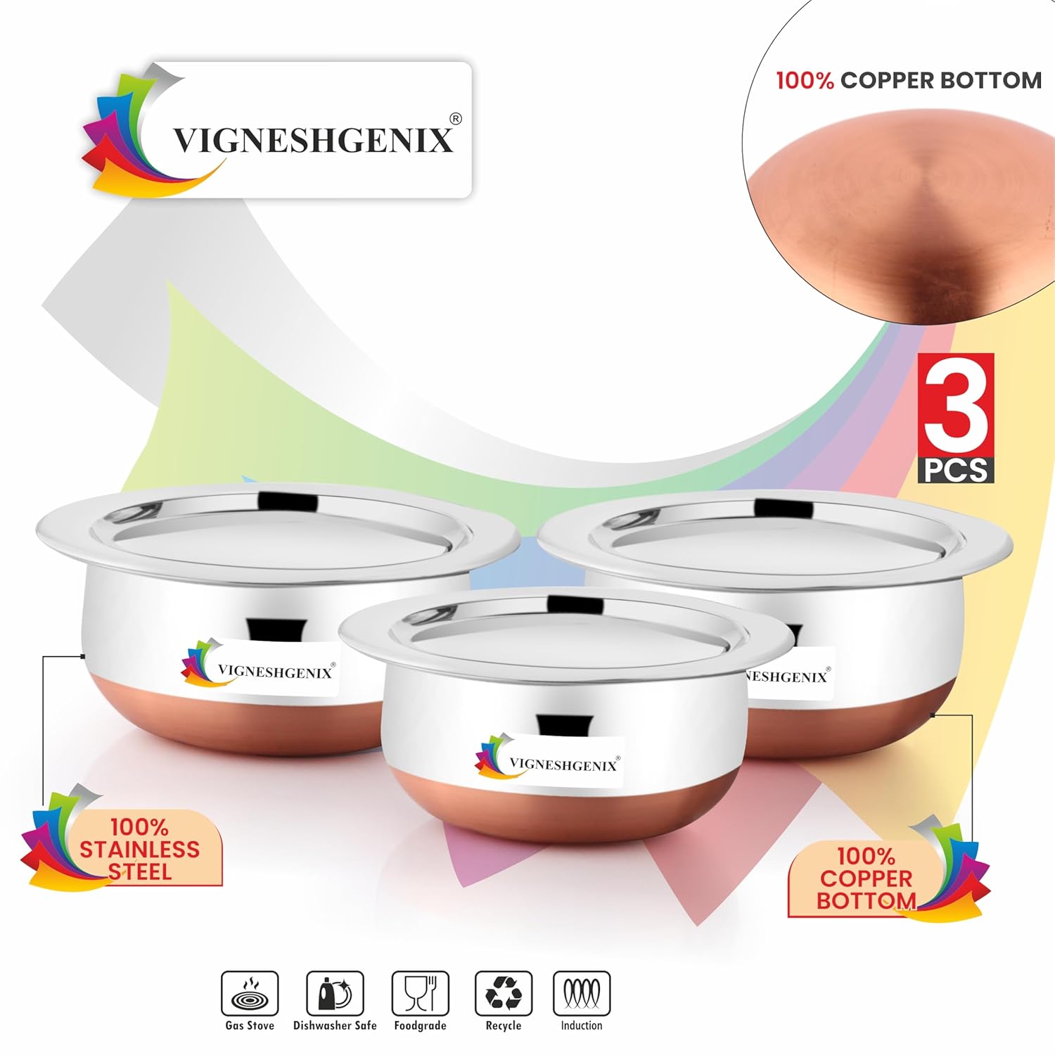 MATERIAL: Copper Bottom. Mirror Finish Stainless Steel Deep Vessel /Handi / Cooking Pot For Kitchen. Export Quality Stainless Steel Making The Utensil Highly Durable, Long Lasting & Rust Free. Giving It A Long Live, Keeping It Beautiful For Years /Generations. Less Stain Steel Cookware.