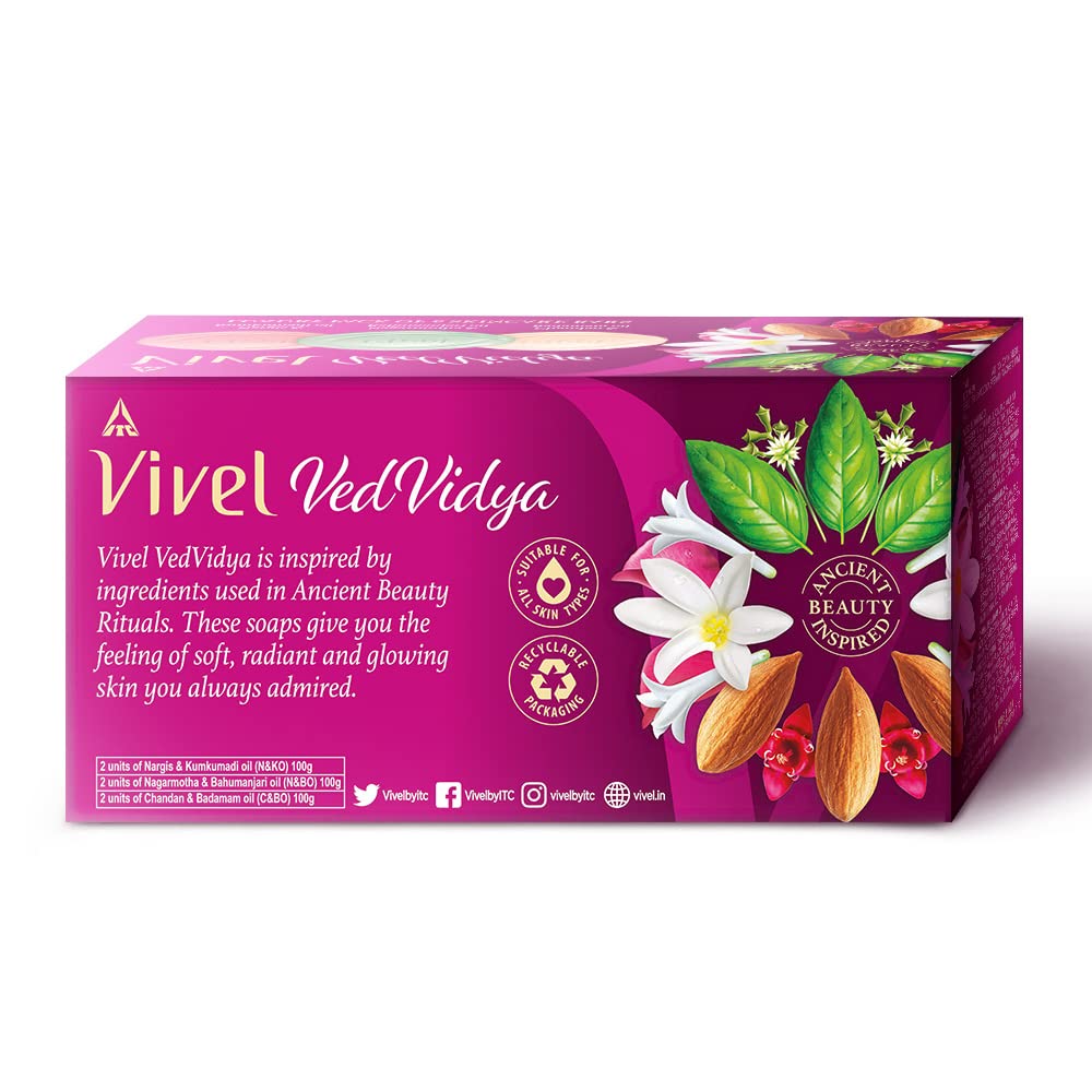 Experience the luxury of ancient beauty baths with Vivel VedVidya, a range of soaps that are inspired by ingredients used in Ancient Beauty Rituals. These soaps nourish your skin and soothe your senses with their enchanting and long-lasting fragrances. The VedVidya Luxury pack offers 3 different variants of soap bars. Crafted with ingredients which finds its place in ancient Ayurveda literature, VedVidya beauty soaps help you rediscover the feeling of soft, even-toned and healthy-looking and radiant, glowing skin. Nargis & Kumkumadi oil bathing bar gives a skin that feels soft and even-toned, Nagarmotha & Bahumanjari oil gives a feeling of soft & clear skin, and Chandan & Badamam oil gives a skin that feels soft and radiant. Our soaps are Dermatologically tested and suitable for all skin types including sensitive skin. So go on and discover the secrets of Vivel VedVidya, packaged with love in recyclable material – preserving your beautiful skin and the planet.