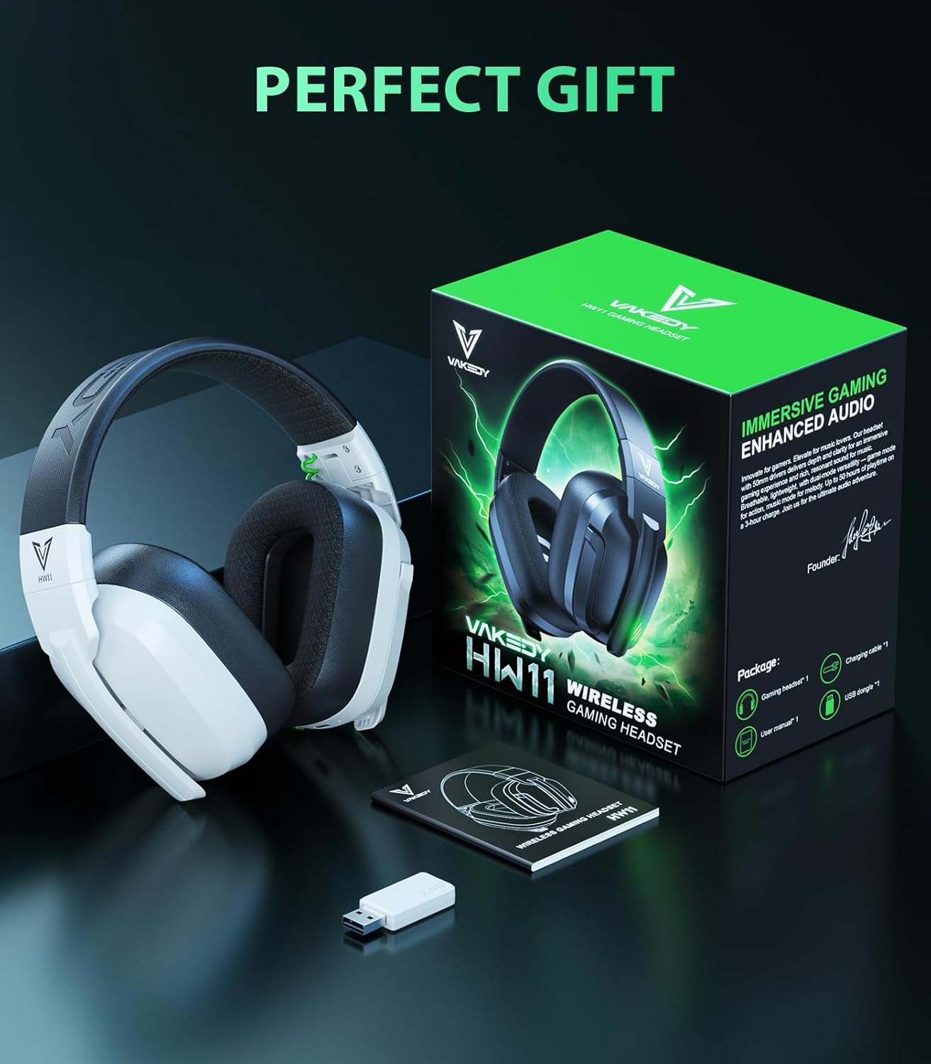 Vakedy HW11 Wireless Gaming Headset for PC, PS4, PS5, Mac,Switch,Bluetooth Gaming Headse with Microphone t 50mm Drivers,50Hr Battery,Low Latency,Black/Green with 1200mAh battery